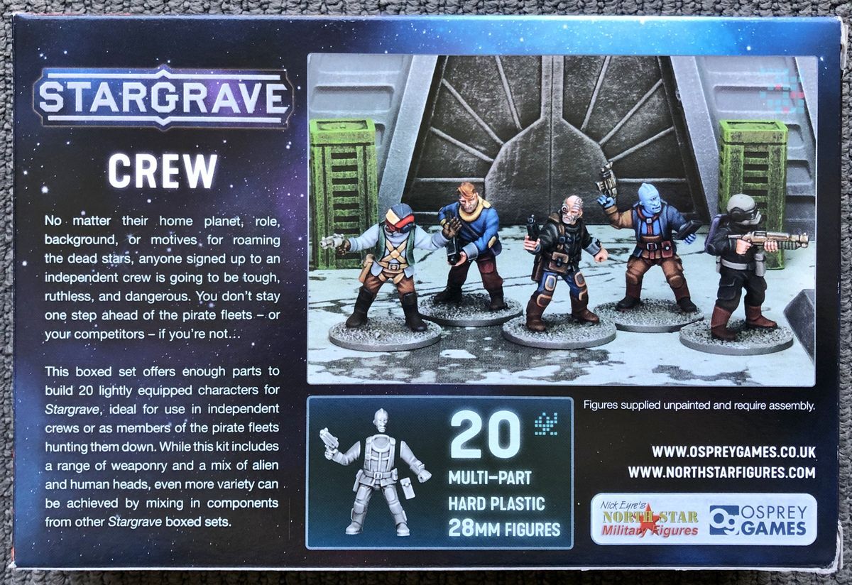 Этот набор предлагает достаточно деталей для создания 20 легко экипированных персонажей для Stargrave, идеально подходящих для использования в свободных экипажах или в качестве членов пиратского флота, охотящегося за ними. Хотя этот набор включает в себя различное вооружение и смесь голов пришельцев и людей, еще большего разнообразия можно достичь добавив детали из других коробочных наборов Stargrave, Frostgrave и Oathmark.