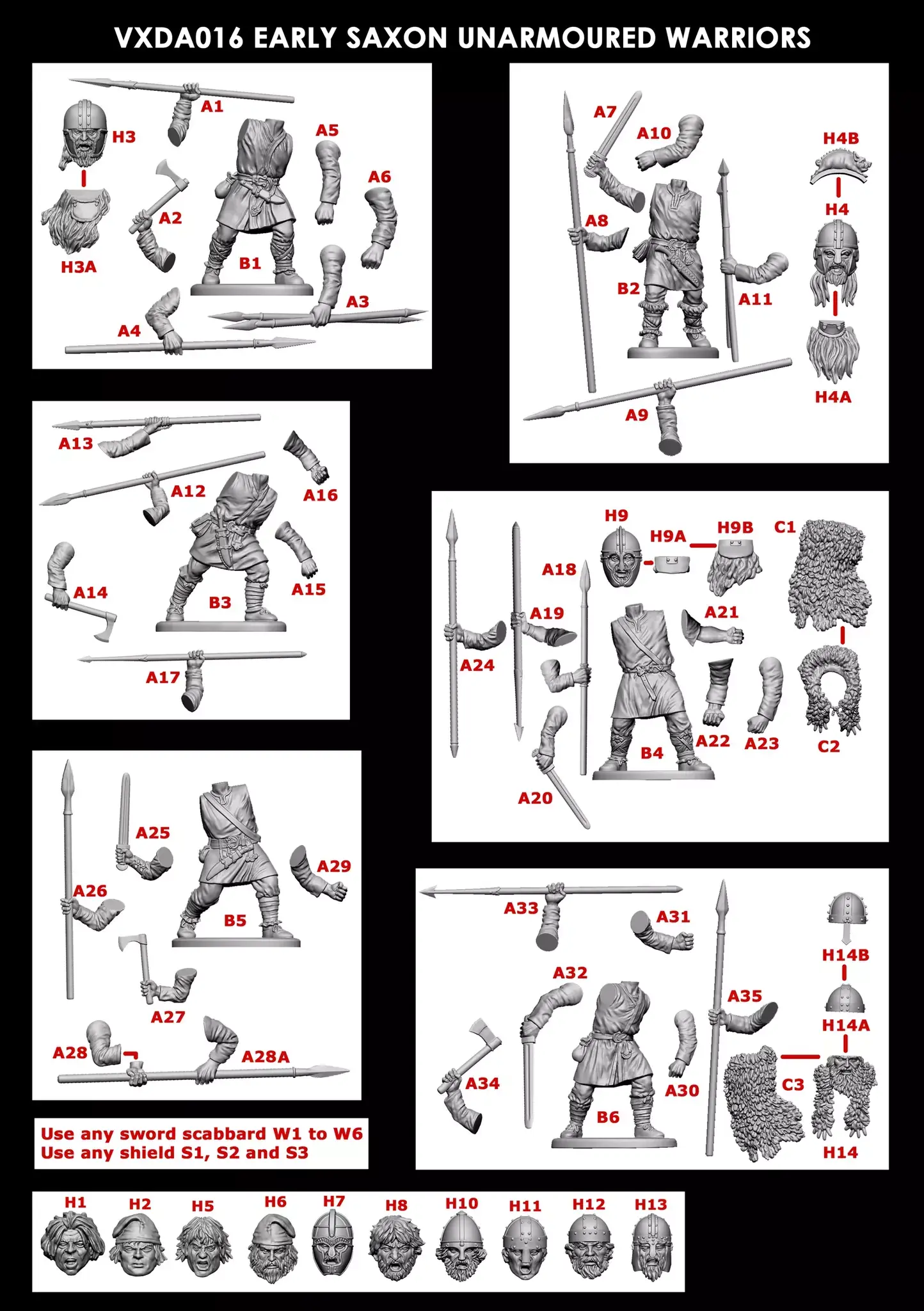 36 раннесаксонских воинов без брони. Эти фигуры представляют ранних саксов, ютов, англов и датчан (все они сгруппированы под названием саксонцы), которые вторглись в Британию (или, возможно, это была скорее миграция?) в течение 4-6 веков. Существует настоящее сочетание вариантов голов: от непокрытой головы до шапок и различных стилей шлемов. Для некоторых дополнительных персонажей были добавлены варианты мехового плаща. Оружие включает мечи, копья, дротики, ручные топоры и некоторые ангоны с наконечниками копий с металлическими гнездами. Они не только сражались с поздними римлянами, но и нанимались римлянами в качестве наемников. Они боролись с романо-британцами за господство в Британии в течение сотен лет, вытесняя коренных жителей Британии на запад и север. Ранние саксы, как правило, использовали круглый щит меньшего размера для парирования и нанесения ударов. Они наносили удар, бросая копья, когда бежали к врагу, и били его копьем, мечом, топором или секирой. Тактика «стены щитов» начала появляться позже. В этот набор включены в комплект как небольшие баклеры, так и круглые щиты большего размера, чтобы вы могли выбрать любой стиль, который предпочитаете. Эти фигурки можно легко использовать в качестве других германских воинов Темных веков и даже смешивать с более поздними саксами и викингами. Фигурки из наборов «Поздние римляне» не выглядели бы неуместно рядом с ними в отряде. Все это добавляет огромное разнообразие к постоянно расширяющемуся ассортименту Dark Age. Вы также сможете менять головы и оружие с набором воинов ранних саксов в доспехах, чтобы сделать еще больше вариаций в ассортименте ранних саксов. Содержимое набора: 36 тел воинов без доспехов 36 маленьких круглых баклеров (9 мм в диаметре) 36 круглых щитов большего размера, наполовину плоских, наполовину слегка куполообразных (диаметр 14 мм) 60 голов в шлемах 30 непокрытых голов и голов в шапках Большое количество мечей, топоров, копий и копий. 12 меховых плащей